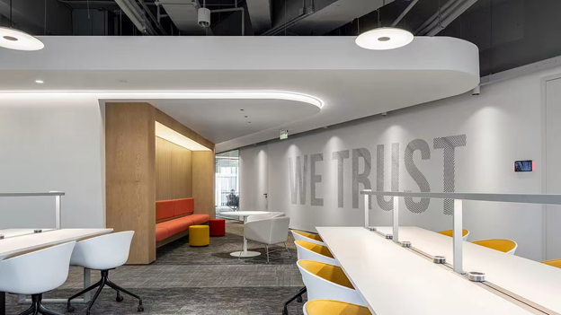 对于一个国际化的运动品牌,“LI-NING”当然也需要将“动”的元素深植空间当中。而对于“动”的理解,设计团队给出了不同的视角:向外微倾斜的核心筒墙面始终让空间处于“动态”中。而接待台、天花以同样的“动态”与墙面呼应。当这些具有力量感的造型与高亮的品牌色相遇,并贯穿整个办公楼层,不仅使空间具有了“李宁”品牌的运动属性,更呼应了“一切皆有可能”的开拓精神。